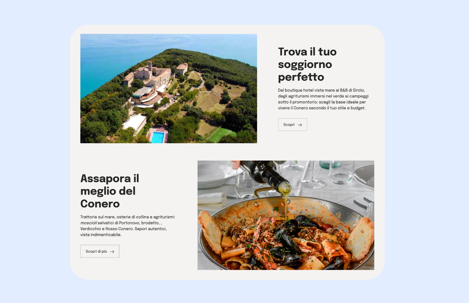 Le destinazioni turistiche locali spesso si affidano a siti statici e poco aggiornabili. L’intento era creare un ambiente digitale che fosse al tempo stesso informativo e emozionale, permettendo all’utente di esplorare il Parco del Conero e le sue strutture in modo fluido e naturale.