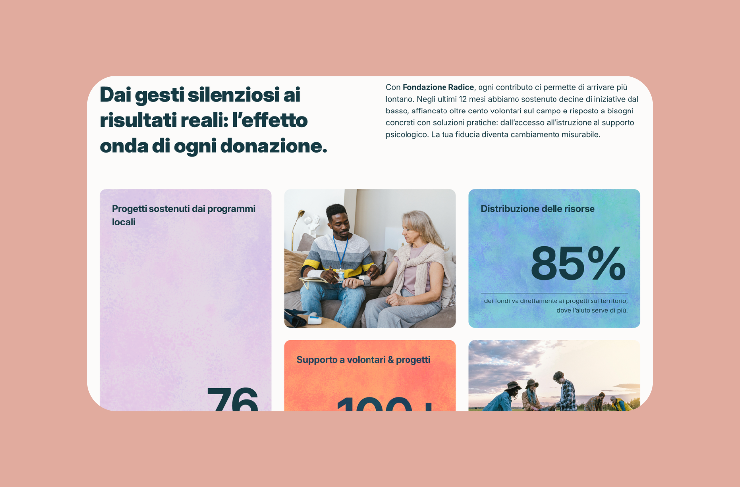 L’obiettivo: rendere tangibili i valori di una fondazione attraverso un linguaggio visivo umano, fluido e facilmente aggiornabile.