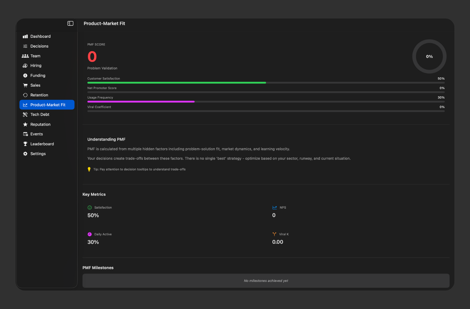 L’obiettivo iniziale era esplorare come concetti complessi come product-market fit, burn rate, retention e reputazione potessero essere resi giocabili, leggibili e misurabili all’interno di un’unica esperienza interattiva.