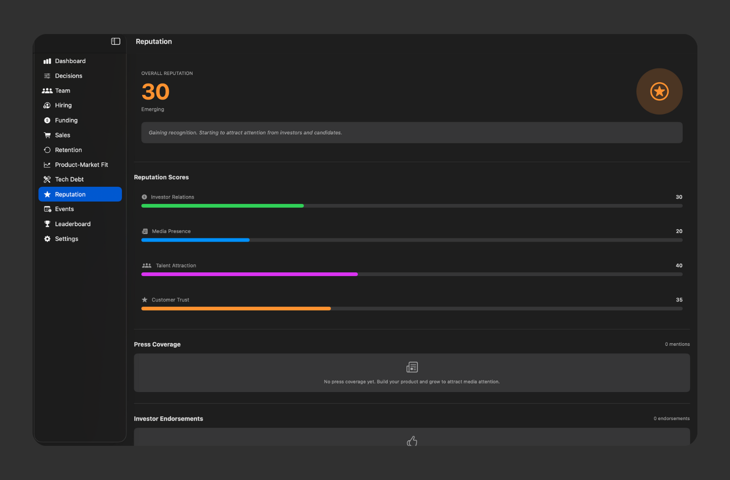 Le decisioni del giocatore agiscono come input strutturati che impattano più sistemi contemporaneamente, influenzando metriche chiave come PMF, burn rate, runway, tech debt, retention, reputazione e valuation.