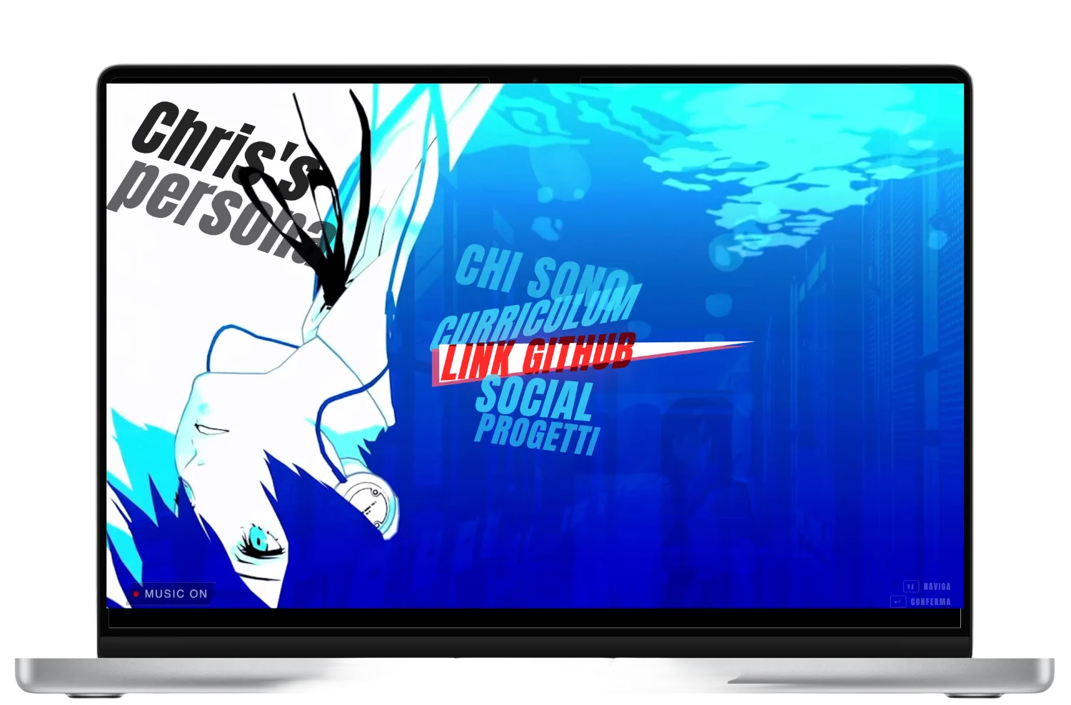 Abbiamo progettato e sviluppato un microsito portfolio costruito attorno a una navigazione a sezioni chiara e fortemente caratterizzata. Il menu è stato pensato come elemento centrale dell’esperienza, richiamando in modo fedele la logica visiva e interattiva di Persona 3. Le transizioni accompagnano il passaggio tra le pagine con continuità, mentre visual e contenuti immersivi rafforzano il mood del progetto. Le sezioni About, Resume, Social e Side Projects mantengono una struttura semplice, leggibile e coerente.